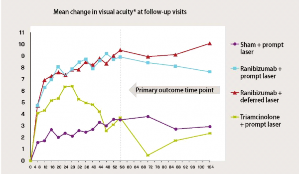 השיפור בחדות הראייה באמצעות VEGF היה ניכר בהשוואה ללייזר בלבד, לסטרואידים, או לשילוב לייזר עם נוגדי VEGF, או לייזר עם סטרואידים[10][11][12][13][14][15].