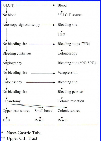 יש לעקוב אחר חולים שבהם הדימום פוסק, ובבדיקות שצוינו לא נתגלתה בהם כל פתולוגיה. בדימום הבא, אם יהיה, יש לבצע בהם אנגיוגרפיה. בחולים שלא יפסיקו לדמם, בדיקת הבחירה היא אנגיוגרפיה. בדיקה חלופית היא מיפוי בעזרת חומר רדיואקטיבי, המסמן כדוריות אדומות. הכדוריות מצטברות במקום הדימום ומסמנות אותו (תצלום 31.6). אפשרות אחרת למיפוי היא בעזרת טכנציום 99 סולפור קולואיד. חסרונה של שיטה זו, שאין היא מסוגלת להראות במדויק את מיקום הדמם, אלא את אזור הדמם - בבטן שמאלית או ימנית.