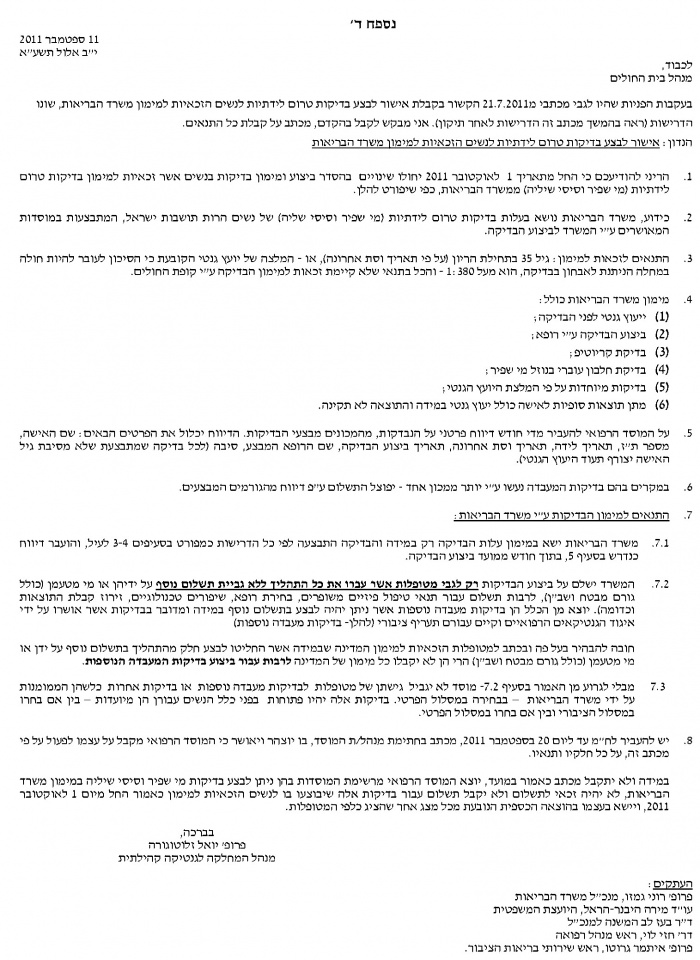 - קבלת אישור בכתב ממנהל המחלקה לגנטיקה קהילתית לביצוע בדיקות עבור נשים זכאיות