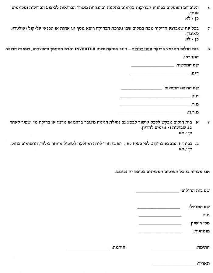 | (4) בבית החולים יש מכשיר על-קול (אולטרסאונד) המתאים לביצוע הבדיקות; | |||
