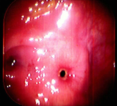 תמונה10.6: דלקת איסכמית של המעי הגס בקולונוסקופיה. נראים אזורי דימום ונמק של הכרכשת