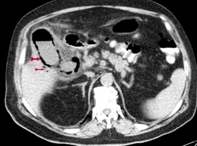 - ב- CT אפשר לראות כיס מרה עם דופן מעובה, אבנים ולעיתים אוויר בדופן המרה Ephysemtous cholelithiasis (תצלום 39.8).