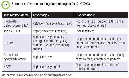 שיטות האמפליפיקציה של חומצת גרעין (NAATs) כגון PCR ו- loop-mediated isothermal amplification מספקות אבחון מהיר ומדויק אך עלותן גבוהה (Deshpande וחב' ב- Clin Infect Dis משנת 2011, Wei ב- Arch Med Sci משנת 2015, ו-O'Horo וחב' ב- Mayo Clin Proc משנת 2012). נראה ששיטת זיהוי וכימות GLDH היא שיטת הסריקה הסבירה ביותר שעלותה נמוכה, וביצועה מהיר (Shetty וחב' ב- J Hosp Infect משנת 2011). שיטות reference אחרות שנכנסות בהדרגה לשגרת המעבדה הן cell cytotoxicity neutralization assay (CCNA) ו- toxigenic culture המתבצעות בדגימת הצואה.