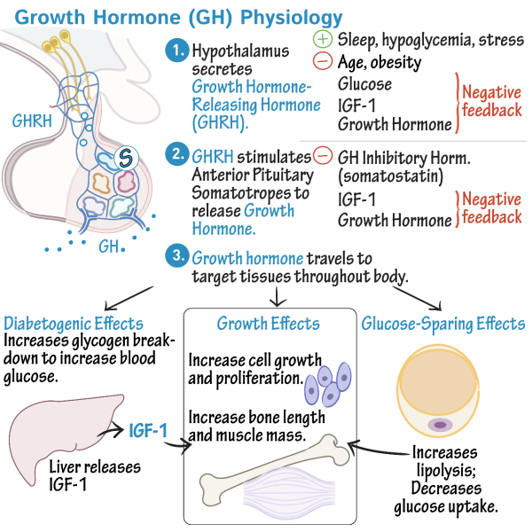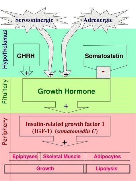 היחס בין GHRH וסומטוסטטין: סומטוסטטין מופרש מקצות העצבים הנוירו-מפרישים של הנוירונים הפרי-ונטריקולריים של סומטוסטטין, והוא נישא על ידי הצירקולציה ההיפותלמית-היפופיזיאלית השערית לבלוטת ההיפופיזה הקדמית, שם הוא מעכב את הפרשת GH. סוממטוסטטין ו-GHRH מופרשים באופן משתנה, תוך שהם מאפשרים הפרשה פעימתית של GH (Lee וחב' ב-JCI Insight משנת 2020). הפעילויות של GHRH מנוגדות לאלו של סומטוסטטין.