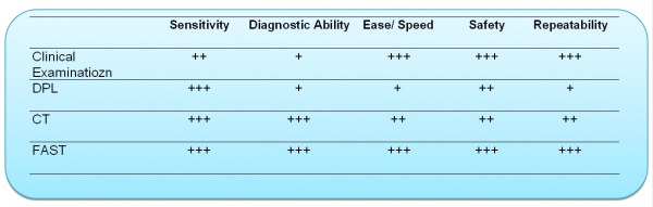 ה-US לזיהוי נוזלים בחלל הבטן FAST הוא הכלי העיקרי להערכת חבלה ודימום תוך-בטני. על שמע מכוון טראומה (Focused Abdominal Sonography for Trauma) הוא כלי אבחוני ראשוני ומהיר לאיתור נוזלים בחלל הצפק. היתרונות הגדולים הטמונים בבדיקה זו הם: היכולת לבצעה בחדר טראומה ללא צורך בשינוע הפצוע, מהירות ביצועה והיותה בלתי פולשנית. בבדיקה זו מאותר נוזל באשר הוא ולא ניתן להבחין באמצעותה בין נוזל שמקורו במעי הדק לבין דם. בנוסף, השגת מידע מהימן בבדיקה זו היא תלויית בודק, דהיינו, מיומנות מבצע הבדיקה משליכה על רגישותה. נראה כי רגישות הבדיקה משתנה בין דיווחים שונים בטווח שבין 67% ל-94% . ערך הניבוי השלילי של בדיקה זו עומד על 99%. טבלה 1.16 מסכמת את ההשוואה בין השיטות השונות לאבחון.
