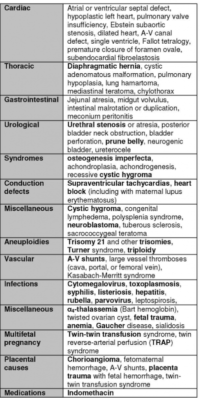 Bellini ושות' (2009) פרסמו סקירה על 5,437 הריונות עם הידרופס לא חיסוני, אותם חילקו ל-14 קבוצות לפי הטבלה הבאה. מומים לבביים מבניים ותפקודיים היו 22% מהמקרים, מומים כרומוזומלים 13%, מומים של מערכת הדם 10% ולרוב גרמו בסוף התהליך לאנמיה ואי ספיקת לב.