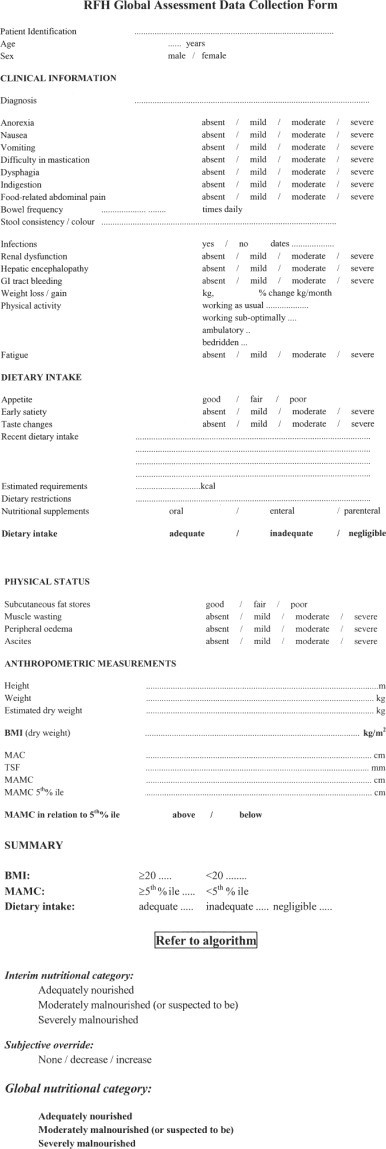 RFH-GA Scheme - כלי זה מתוקף לחולי שחמת הכבד. הכלי כולל שאלון מפורט על מדדים אובייקטיביים וסובייקטיביים (תרשים מצורף בנספח 3): BMI, היקף זרוע, צריכה תזונתית, פעילות גופנית והערכה קלינית לגבי תפקוד כלייתי, כבדי ותסמונות של מערכת העיכול (כמו שלשול, הקאות ואנורקסיה). לכל פרמטר ישנו דירוג הנסכם לקביעת קטגוריות לסטטוס תזונתי: תקין, בינוני או ירוד. בנוסף, בדירוג הכללי ישנה התייחסות סובייקטיבית של הבודק[16]. RFH-GA נמצא כמנבא תמותה בחולי שחמת וסיבוכים לאחר השתלה[9]. כלי זה פשוט ולא יקר, אך דורש זמן ומיומנות של הבודק.