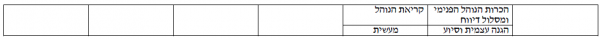 | 1 | קיים גוף מטה, בדרג הנהלה, לקידום מניעה וניהול אירועי אלימות | על פי עיון בתיעוד |