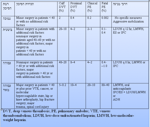 כמו כן, יש לבצע הערכה תזונתית. כל אלה יכולים לכוון לצורך בבירור מעמיק יותר של מערכת קרישת הדם. חולים המועמדים לניתוח שאין להם גורם סיכון בסיפור הקליני אינם צריכים לעבור ברור מעבדתי של תפקודי הקרישה (תרשים 1). חולים המקבלים תרופות נוגדי קרישה מסוג ה-Warfarin, צריכים להפסיק את הטיפול מספר ימים לפני הניתוח על מנת להחזיר את ערכי ה-INR ( International Normalized Ratio) לתקין (1.5>). חולים שההתוויה לשימוש בנוגדי קרישה היא יחסית אינם זקוקים לטיפול אחר נוגד קרישה סביב הניתוח. לעומת זאת, חולים שבהם ההתוויה היא חד-משמעית יש להמשיך במתן הפרין תוך ורידי או Clexane בזריקות תת-עוריות. את ההפרין יש להפסיק שש שעות לפני ניתוח ולהתחיל מחדש 12 שעות לאחר ניתוח. בחולים עם מאורע טרומבו-אמבולי שאירע זה עתה, יש לעכב את הניתוח לפחות לחודש ימים. חולים הזקוקים לניתוח דחוף בטווח של שבועיים מפקקת ריאתית, או DVT (Deep Venous Thrombosis), יש לשקול הכנסה של "מטריה" לווריד החלול התחתון לפני הניתוח. השינוי בטיפול נוגד הקרישה הפומי, בחולים לפני ואחרי ניתוח בהתאם להתוויה לטיפול מסוכמים בטבלה 3.20. כל החולים חייבים לעבור הערכה של הסיכון לפתח אירוע טרומבואמבולי בזמן הניתוח ולקבל טיפול מונע בהתאם להנחיות. הסיכון לפקקת ורידית ואירועים טרומבואמבולים בהתאם לגורמי סיכון וגודל הניתוח וגישה המניעתית מסוכמים בטבלה 4.20.