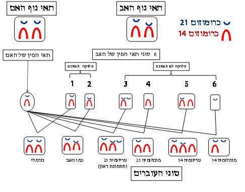 במקרה של התקה 14/21, (ונניח שזה אצל האב), יש חיבור בין כרומוזום אחד מן הזוג מס' 14 לבין כרומוזום אחד מן הזוג מס' 21. כלומר לאב זה יש למעשה 45 כרומוזומים שאחד מהם מורכב מכרומוזום 14 וכרומוזום 21 מחוברים זה לזה. כל המטען הגנטי קיים אך הוא מחובר זה לזה בכרומוזומים אלה. בזמן יצירת תאי הזרע, בזמן חלוקת ההפחתה קורה שהחלוקה אינה מאוזנת וגורמת להיווצרות עובר שאינו מאוזן כפי שנראה מן האיור הבא: