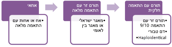 כאשר לא נמצא תורם זר עם התאמה מלאה ישנן מספר אפשרויות נוספות לאיתור שתל תורם (כפי שרואים בתרשים מספר 2):