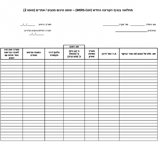 | סימוכין | חוזר ראש שירותי בריאות הציבור 10/13 מתאריך 22.5.13 על נגיף הקורונה החדש (MERS- CoV), וחוזרים מספר 7/2014 מתאריך 5.5.2014 ומספר 9/2015 מתאריך 16.6.15 | |