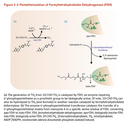 אנזים זה מקטלז את ההמרה של formyltetrahydrofolate-10 ל- tetrahydrofolate שהוא קו-פקטור חשוב במטבוליזם של חומצות גרעין ושל חומצות אמינו. בדומה ל-ACP, גם FDH דורש קבוצה פרוסטתית דוגמת phosphopantetheine-'4 לפעילותו הביולוגית. קבוצה פרוסטתית זו פועלת כזרוע מבצעת לאחד את הפעילויות של 2 המקטעים הקטליטיים שלFDH (Donato וחב' ב-J Biol Chem משנת 2007, ו-Strickland וחב' משנת 2100). הומולוג של FDH הנמצא במיטוכונדריה דורש גם כן phosphopantetheinylation-'4 לצורך פעילותו הביולוגית (Strickland וחב' ב-Chem Biol Interact משנת 2011). תמונה 3 למטה: