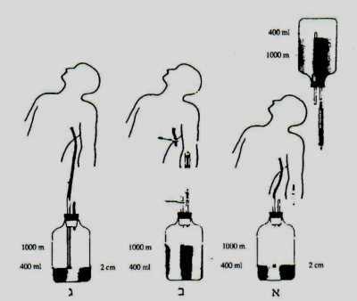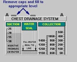 • יש לקבוע את הנקז לדופן החזה על-ידי תפר חזק בעור. הנקז מחובר לבקבוק מים מיוחד (Under water seal), הסגור הרמטית ומכיל בראשו 2 צינורות (איור 11.10- 12.16). האחד, אליו מתחבר הנקז, מצוי מתחת לפני המים, והשני, הקצר, מצוי מעל לפני המים. בעת הנשיפה יוצא האוויר החופשי מחלל הצדר דרך הנקז וממשיך דרך הצינורית הארוכה אל המים ומשם דרך הצינורית הקצרה החוצה. בעת שאיפה, האוויר אינו חודר לבית החזה מכיוון שהמים בבקבוק חוסמים את מעבר האוויר. בזמן השאיפה המים בצינורית הארוכה עולים בהתאם ללחץ השלילי המתפתח בבית החזה. תנועת המים בצינורית מצביעה על כך שמיקום הנקז הוא בבית החזה.