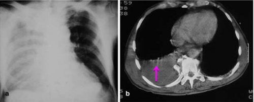 תצלום 10.16: צילום חזה מראה חזה דם (החיצים מורים על גבול בין הריאה לצבר הדם בחזה).