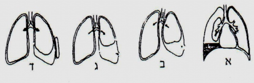איור 8.16: א. חזה דם ב. חזה אוויר בשאיפה ג. חזה אוויר בנשיפה; ד. חזה אוויר כאשר הפתח בעור נאטם.