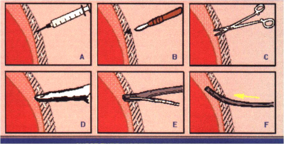 איור 10.16: טכניקת החדרת הנקז החזי. A- אילחוש מקומי B –חתך המרווח הבין צלעי רביעי C- הרחבת החתך D- הכנסת האצבע לוודא שאנו בחלל הצדר E- הכנסת הנקז בעזרת מלקחיים F- נקז בחלל הצדר ומקובע לעור.