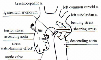 קרע של הוותין החזי וכלי הדם הברכיוצפליים - חבלות חזה וחבלות האטה יכולות לגרום לקרע של הוותין. הקרע מתרחש בדרך כלל מעט רחיקנית לליגמנטום ארטריוזוס (איור 20.16). דימומים אלה הם קטלניים. כאשר הקרע אינו שלם והעטיפה החיצונית (adventitia) נשארת שלמה נוצרת מפרצת מדומה. בחבלות כאלה ניתן לראות הרחבה של המיצר ואז לאמת את האבחנה על-ידי ארטריוגרפיה וטומוגרפיה ממוחשבת. הסורק הממוחשב הסלילי מאפשר להדגים את כלי הדם בחזה בצורה טובה ולכן חוסך את הצורך באנגיוגרפיה אבחנתית. הטיפול הוא שמרני וניתוחי (ראה חבלות באבי העורקים בפרק זה). חבלה בסטרנום יכולה לחשוף את עורקי האינומניאט, הסובקלויה והקרוטיס לפגיעה דומה.