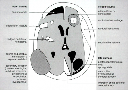 הנזקים המאוחרים של החבלות המוחיות הם: Leukomalacia, אוטמים מוחיים, ציסטות מוחיות, הידרוצפלוס ואטרופיה מוחית, המשאירים נזקים תמידים. הנזקים הללו ניתן להדגמה ב-CT מוח (תצלום 6.16).