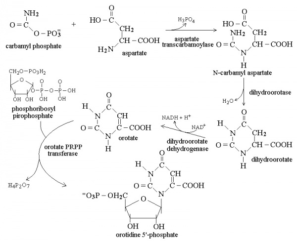 מסלול הביוסינתזה של פירימידין כולל בתוכו את שלב יצירת חומצה אורוטית. המסלול מתחיל כאשר מולקולת גלוטמין בתוספת 2 מולקולות ATP יוצרת קרבמואיל-פוספאט, כאשר האחרון נקשר לחומצה אספרטית ליצירת קרבמואיל-אספרטאט. חומר ביניים זה בעזרת האנזים dihydroorotase יוצר את התרכובת dihydroorotate, והאחרונה הופכת לחומצה אורוטית בעזרת האנזים המיטוכונדריאלי dihydroorate dehydrogenase. החומצה האורוטית מתחברת עם PRPP או phosphoribosyl pyrophosphate בעזרת האנזים orotate PRPP transferase, ליצירה של OMP או orotidine-5'-monophosphate. התוצר האחרון הזה יהפוך בשלב האחרון ל-uridine-5’-monophosphate. תכונה ייחודית של סינתזת פירימידין היא בכך שטבעת הפירימידין עוברת סינתזה מלאה לפני שהיא נקשרת ל-ribose sugar, ואילו סינתזה של פורין (purine) מתרחשת על ידי בניית הבסיס ישירות על פני הסוכר.