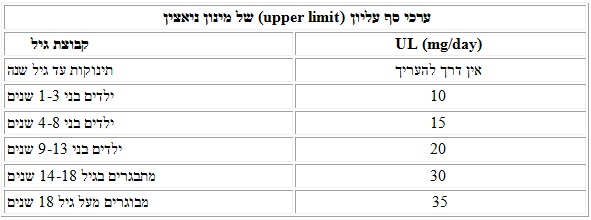 בארה"ב , הצריכה היומית הממוצעת בדיאטה של ניאצין חיא 30 מיליגרם ביום לגברים צעירים ו-20 מיליגרם לנשים צעירות. מעל גיל 60 שנה, גברים בארה"ב צורכים ביום בממוצע 21 מיליגרם ונשים 17 מיליגרם ניאצין ביום. להלן ערכי סף עליון מותרים של צריכת ניאצין: