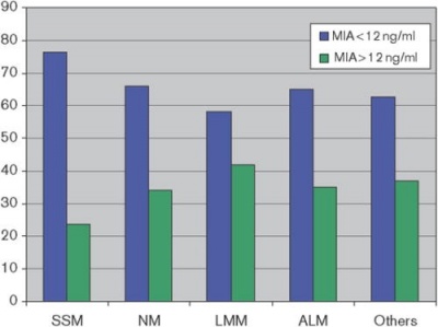 מחקר של Bosserhoff וחב' ב-Cancer Research משנת 1997, מצא תוך שימוש בסף נורמה עליון של 6.5 ננוגרם/מ"ל, ש-MIA מוגבר ב-13% מאלה ב-stage I, ומוגבר ב-23% מהמטופלים ב-stage II של המחלה. לעומת זאת, רמת MIA הייתה מוגברת ב-100% מאלה ב-stage III ו-stage IV של המחלה. יש לציין שבנבדקים בריאים רמת MIA נמצאה מוגברת ב-2.7% מהנבדקים, אך ההבדלים ברמה הממוצעת של MIA היו משכנעים יותר: באנשים בריאים הרמה הממוצעת של MIA הייתה 3.6 ננוגרם/מ"ל, באלה ב-stage I הרמה הממוצעת נמצאה כ-4.4 ננוגרם/מ"ל, ב-stage II נקבעה רמה ממוצעת של 5.0 ננוגרם/מ"ל, ב-stage III נמצא ערך ממוצע של MIA של 10.4 ננוגרם/מ"ל, ובאלה עם stage IV נקבעה רמת MIA ממוצעת של 24.8 ננוגרם/מ"ל. לשם השוואה יצוין שמדידת הסמן S100B העלתה שרמתו הייתה אמנם תקינה בכל הדגימות משלבים I ו-II של המחלה, אך בניגוד ל-MIA שרמתו הייתה מוגברת ב-100% של הדגימות משלבים III ו-IV של המחלה, הרי ש-S100B נמצא מוגבר רק ב-60% מהדגימות בשני שלבי המחלה המוגברים.