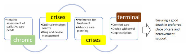 אי-ספיקת לב היא מחלה מתקדמת (progressive) וברוב המקרים ללא החלמה כשחציון ההישרדות במטופלים לאחר אשפוז ראשון על רקע אי-ספיקת לב הוא כשנתיים וחצי[1]. ישנה התקדמות מהירה והתפתחות דרמטית באפשרויות הטיפול הקרדיאלי הן התרופתי והן ההתערבותי וכתוצאה מכך לאורך ציר המחלה ישנן צמתי החלטה מהותיים מולם עומד המטופל ויש חשיבות לשילוב גישה פליאטיבית שתתאים את הטיפול לעולם הערכי של המטופל. מטופלים עם אי-ספיקת לב מתקדמת נמצאים גם בסיכון מוגבר לסבול מריבוי תסמינים פיזיים, רגשיים וחברתיים ההולכים וגוברים במהלך התקדמות המחלה, וקיים צורך בקבלת החלטות מורכבות המצריכות תקשורת רגישה במהלך ציר ההתקדמות של המחלה[2].