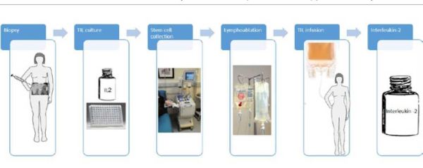 הטיפול התאי כולל דגימה של אתר מחלה וזריעת חלקי הגידול בתרבית המכילה את הציטוקין IL-2 (Interleukin-2). תנאי התרבית נותנים עדיפות לגדילה של לימפוציטים, אם TILs אלו גדלים, הם מופרדים ומתורבתים עד להגעה למאות מיליוני תאים. במקביל, המטופל מקבל טיפול כימי הכולל Fludarabine (Fludara)[2] ו-Cyclophosphamide/Cytoxan (Endoxan)[2] (או בפרוטוקולים מסוימים שילוב עם הקרנה כל גופית - TBI, Total Boday Irradiation) אשר מביא לדלדול של הלימפוציטים במטופל, ללא הכחדה של מח העצם. בשלב הבא הלימפוציטים מהתרבית מועברים בחזרה למטופל, ולאחר מכן ניתנות מנות חוזרות של IL-2 דרך הווריד (ראה תרשים מספר 1). המטופל מאושפז עד חלוף תופעות הלוואי, ובפרט עד התאוששות מח העצם.