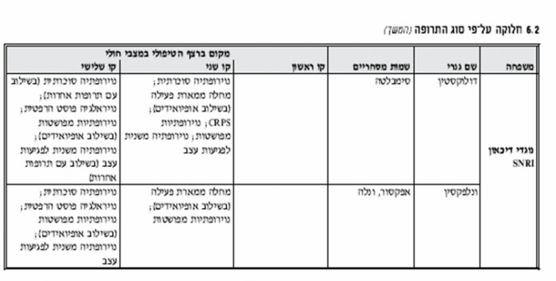 2. קו שני: Lyrica, ‏Gabapentin, ‏Duloxetine. יש לנסות כל אחת מהתרופות לפני מעבר לקו שלישי.
