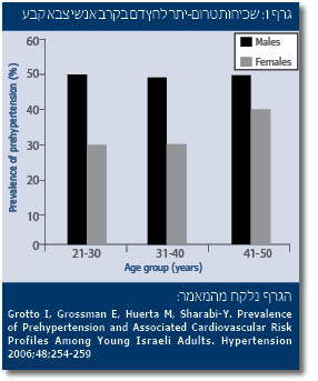 בסקר אחר שבוצע בארץ בקרב 36,424 אנשי צבא קבע בגיל 50-21 שנבדקו באופן שגרתי בין השנים 1999-1991 נמצא טרום-יתר לחץ דם בשכיחות של 48.9%. השכיחות הייתה גבוהה יותר בגברים מאשר בנשים ולא השתנתה בגברים עם הגיל, אך עלתה עם הגיל בנשים (גרף 1).