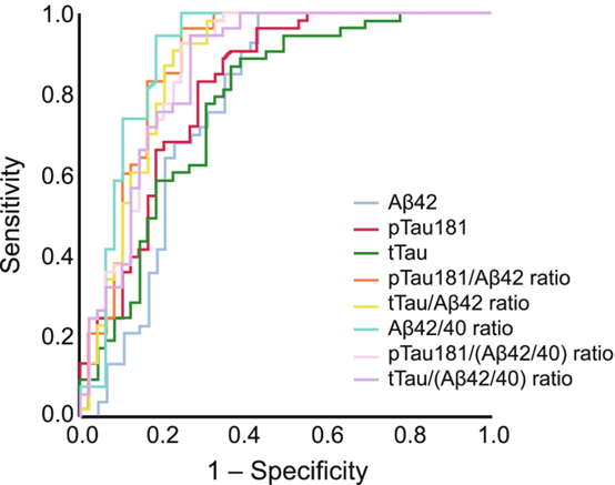השימוש ביחס בין p-Tau181/Abeta42 מספק תאום טוב יותר עם סריקת amyloid-PET בהשוואה לשימוש יחידני ב-Abeta42, p-Tau181 ו-t-Tau. Cutofff של 0.028 מספק איזון אופטימלי בין אחוז הסכם שלילי (NPA) ובין אחוז הסכם חיובי (PPA) בהשוואה לתוצאות PET של עמילואיד. יחס p-Tau181/Abeta42 של 0.028 או פחות מכך, הוא בעל 92% NPA עם amyloid PET נורמלי. יחס הגבוה מ-0.028 הוא בעל 92% של PPA עם amyloid-PET לא-נורמלי. ריכוזים גבוהים של t-Tau ב-CSF מוצאים במחלות נוירו-דגנרטיביות אחרות כגון מחלת prion או מחלת Creutzfeldt-Jakob. במצב זה, ריכוז גבוה של t-Tau ויחס מוגבר של t-Tau/p-Tau הוא בעל ספציפיות מאוד גבוהה לאבחון מבדיל של AD. כאשר מודדים רכוזי Abeta42, p-Tai181 ו-t-Tau ב-CSF בשיטת ה-immunoassay של Elexys שעברה התאמה לשימוש באנלייזר של cobas e 411, ריכוזי Abeta40 נמדדו בשיטה לא-מסחרית של Youden, והאנליזות של ROC ושל AUC בוצעו בהשוואה ל-amyloid-PET. ההערכות של רגישות ושל ספציפיות של סמני ה-CSF והיחסים בין סמנים אלה לעומת amyloid PET נקבעו כ-0.93 ו-0.57 בהקשר של Abeta42 , 0.96 ו-0.69 בהקשר של p-Tau181/Abeta42, 0.92 ו-0.69 בהקשר של t-Tau/Abeta42, ו-0.94 ו-0.82 בהקשר של Abeta40. באשר ל-AUC - ההערכות הנקודתיות לעומת amyloid PET הן 0.78 בהקשר של Abeta42, 0.88 בהקשר של p-Tau181/Abeta42, 0.87 בהקשר של t-Tau/Abeta42, ו-0.90 בהקשר של Abeta42/40. הנוכחות של סמנים שונים קובעת את סטאטוס המחלה של כל מטופל, דהיינו כאשר המטופל הוא בעל שינוי אלצהיימרי פתולוגי בלבד, או אם הוא מוגדר כחולה ב-AD (Hansson וחב' ב-Alzheimers Dement משנת 2018). יש שתי שיטות לזיהוי in vivo של פתולוגיה של Abeta: ראשית, שיטת PET למדידת פתולוגיה של Abeta על ידי שימוש ב-tracers שונים של קישור Abeta כגון [18F]-flutenmetamol ו-[18F]-florbetapir (Pannee וחב' ב-J Neurochem משנת 2016). קיים מתאם גבוה בין ה-tracers השונים (Bittner וחב' ב-Alzheimers Dement משנת 2016), שעברו תיקוף כנגד פתולוגיה של Abeta הנמדדת על ידי גישה היסטו-פתולוגית (Shindler וחב' באותו כתב-עת משנת 2018, ו-Doecke וחב' ב-Alzheimers Res Ther משנת 2020). שנית, ניתן לזהות פתולוגיה של Abeta על ידי מדידת הריכוז של Abeta42 ב-CSF, שהיא שיטה אמינה, בעלת עלות-יעילות טובה ואף מהירה המהווה חלופה ל- amyloid-PET (Janelidze וחב' ב-Ann Clin Transl Neurol משנת 2016, Alcolea וחב' באותו כתב עת משנת 2019, ו-Albert וחב' ב-Alzheimers Dement משנת 2011).