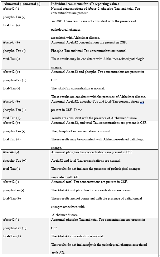 תוצאת בטא-עמילואיד (1-42; Abeta42) הגבוהה מ-834 פיקוגרם/מיליליטר תואמת תוצאה שלילית של סריקת PET של עמילואיד, המצביעה על אי-נוכחות או על נוכחות מועטה של רבדים נויריטיים, ומתאימה לאבחון נוירו-פתולוגי של AD. סך-Tau (t-Tau) ו-Tau מזורחן (p-Tau181) ב-CSF בריכוז הגבוה פי-2-3 מזה שמופיע ב-AD קלה עד מתונה בהשוואה לביקורת תואמת-גיל. ריכוז של t-Tau ו/או של p-Tau181, הנמוך או שווה ל-238 פיקוגרם/מ"ל, ונמוך או שווה ל-21.6 פיקוגרם/מ"ל, בהתאמה, מפחית את הסבירות שהבעיה הקוגניטיבית של המטופל נגרמה כתוצאה מ-AD.