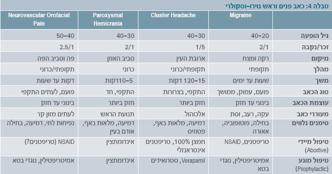 עם הכאבים הנוירו-וסקולריים של הראש והפנים נמנים (טבלה 4): מיגרנה, כאב ראש מצררי, כאב ראש חצי-גולגולתי התקפי, וכאב פנים נוירו-וסקולרי.