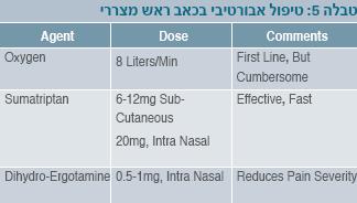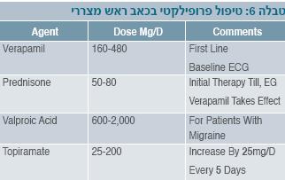 הטיפול המיידי כולל מתן חמצן בקצב של 8 ליטר לדקה, במשך 15 דקות, וכן Imitrex‏ (Sumatriptan) תוך-אפי (Intranasal). הטיפול המניעתי המומלץ הוא באמצעות Verapamil וסטרואידים (טבלה 6 ו-7).