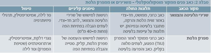 הכאב הכרוני השכיח ביותר באזור הפנים הוא כאב במערכת השרירים והשלד, שמקורו בשרירי הלעיסה והצוואר או במפרק הטמפורומנדיבולרי. מקורות כאב אחרים בפנים קשורים למנגנונים דמויי מיגרנה, כמו כאב פנים נוירו-וסקולרי או כאב ראש מצררי, וכאב נוירופתי כמו ניורלגיה של העצב המשולש, או כאב לאחר חבלה לעצב (טבלאות מס' 7,4,3,2). יש להדגיש, שבדומה לכאב כרוני במקומות אחרים בגוף, כאב כרוני באזור הפנים אינו מגיב לתרופות משככות כאב, ותרופות מתחומים שונים, כמו תרופות נוגדות לחץ דם, נוגדות אפילפסיה ונוגדות דיכאון הן התרופות הנבחרות.