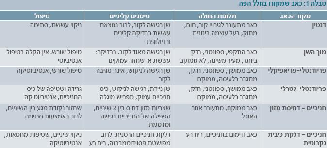 ניתן לחלק את הכאב החריף מחלל הפה לכאב שיניים [שמקורו בדנטין (Dentin) ובמוך השן], כאב מרקמות התמיכה של השן (Periodontal-periapical and lateral), ומן החניכיים (כגון כאב הנובע מדחיסת מזון או מדלקת כיבית-נמקית), וכן מנגעים ברקמות הפה האחרות, כמו הלשון והלחיים (כגון אפטות או זיהום נגיפי) (טבלה 1).