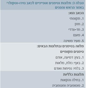 לכאב הנוירו-וסקולרי באזור הראש והפנים מספר מאפיינים משותפים (טבלה 3), הכוללים כאב תקופתי (Periodic) חזק, חד-צדדי, פועם ולרוב מעיר מן השינה. לכאב מתלווים סימנים מקומיים, כגון דמיעה ואודם בעין, גודש באף ונזלת חד-צדדית ונפיחות של הלחי. נוסף על כך, יש בחילה עד להקאה, ואור, רעש ומאמץ גופני מחמירים את הכאב ואינם נסבלים.