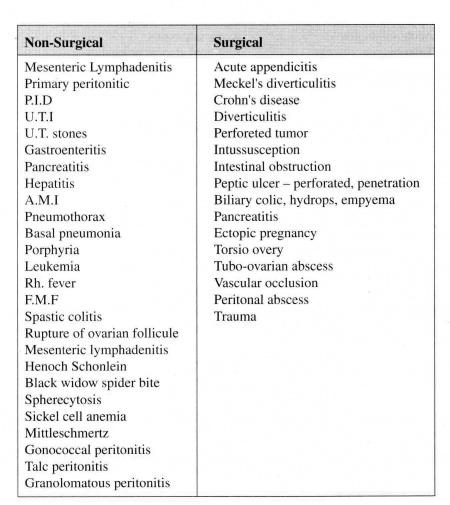 הסיבות לדלקת צפק הדורשת או אינה דורשת טיפול כירורגי מסוכמות בטבלה 2.2.