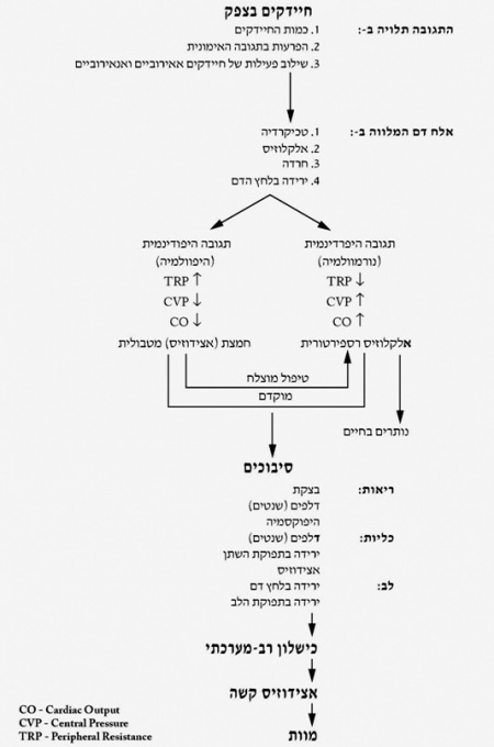 מכיוון שדלקת הצפק מגדילה את התצרוכת המטבולית, יש לתת לחולים אלה חמצן. החולים סובלים מהפרעות בנשימה, עקב התרחבות המעי, תפיחות הבטן והרמת הסרעפת, ועקב כך ניכרת ירידה בנפח שאריתי תפקודי (Functional residual capacity - FRC), עלייה ב- Closing volume ובעקבות זאת דלף ריאתי ואטלקטזות. (תרשים 2.2)