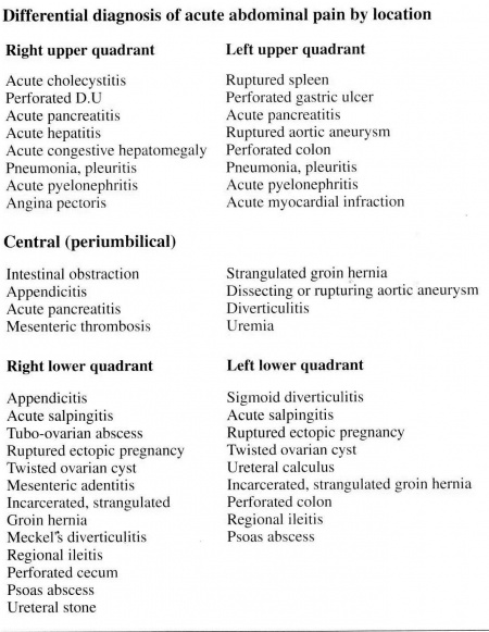 - מיקום כאב הבטן הוא נקודת התחלה חשובה. לדוגמה, כאב בטן ימנית תחתונה מרמז בצורה חזקה על דלקת של התוספתן. למרות שממצאים מסוימים באנמנזה ובבדיקה גופנית יכולים לעזור, לממצאים אחרים יש ערך מוגבל. לדוגמא, עצירות והרחבה בטנית הם אינדיקטורים חזקים של חסימת מעי, אך לחוסר תיאבון יש ערך דיאגנוסטי נמוך לדלקת של התוספתן.
