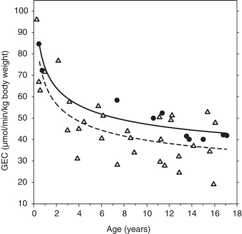 Lange וחב' פרסמו בשנת 2011 ב-Scand J Gastroenterol מחקר בו מדדו ערכיGEC בילדים בריאים ובילידים עם מחלת כבד כרונית בגילאים השונים. בתמונה למטה מסומנים ילדים בריאים כעיגולים שחורים, ואילו ילדים עם מחלת כבד מסומנים כמשולשים.