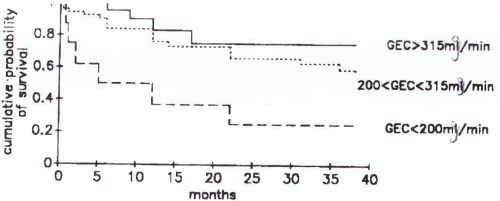 גם Markel וחב' פרסמו ב-Dig Dis Sci משנת 1991 תוצאות מחקר אליו גויסו 78 מטופלים מאובחנים על צמקת הכבד, שכולם היו במעקב פרוספקטיבי של עד 20 חודש בממוצע. בכניסה למחקר נמדד אצלם ערך GEC. כתום תקופת המחקר התברר ש-27 מבין המשתתפים בו נפטרו. אנליזה חד-משתנית בשיטת Kaplan-Meier הראתה שמדידת GEC הייתה מדד פרוגנוסטי פחות מובהק כמנבא להישרדות (0.025p<), בהשוואה לממצאים קליניים כגון אנצפלופתיה או מיימת (ascites) עם 001p<0., או בהשוואה למדדים ביוכימיים מקובלים כגון רמת בילירובין בנסיוב (0.005p<), רמת אלבומין (0.001p<), וטובה במקצת ממדד זמן פרותרומבין (0.05p<). כדי לבחון את השאלה האם בדיקת GEC עשויה לתרום לשיפור ההערכה הפרוגנוסטית של הישרדות הנבדק, כאשר נתוניו כבר נכללים במדרג Child-Pugh, בוצעה אנליזת multiple regression על פי הדגם של Cox. נמצא שיפור קל בהערכה הפרוגנוסטית בהתייחסות משולבת של מדרג Child-Pugh וממצאי GEC.
