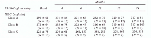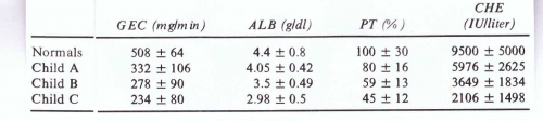 פרמטרים ביוכימיים (אלבומין, זמן פרותרומבין ופסאודו-כולנאסטראזה) כמו גם GEC , בנבדקים נורמאליים ובחולים על פי שלושת הקריטריונים של Child-Pugh score מ-class A (הקל ביותר) ל-class C (החמור ביותר).