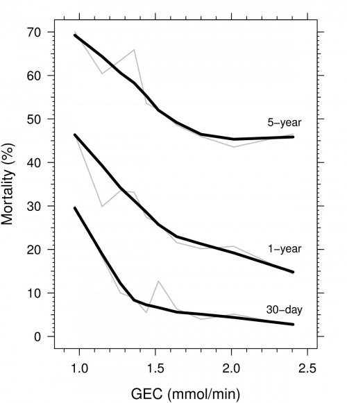 תמותה מכל-סיבה לאחר 30 יום, שנה אחת או 5 שנות מעקב לאחר מדידת GEC בקרב 781 חולי צמקת.