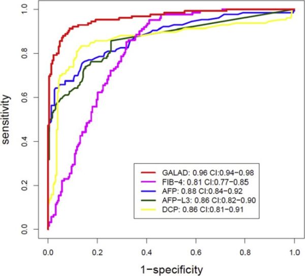 אינטרפרטציה: תוצאות מוגברות של מודל GALAD נמצאות במתאם עם סיכון מוגבר של HCC. השטח מתחת לעקומה (AUC) של עקומת ROC של מודל GALAD נמצא כ-0.95 במקרי HCC, ו-0.92 במקרים של שלב מוקדם של HCC. בנוסף, ה-AUC של GALAD היה גבוה מזה של בדיקת אולטרה-סאונד יחידנית בכל מקרי HCC (AUC של 0.82 P <0.01).