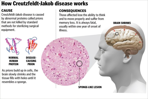 מחלת ה-prion השכיחה ביותר באדם היא CJD, המהווה למעלה מ-85% מכל מחלות prion האנושיות. CJD תואר לראשונה על ידי Jacob בשנת 1921 ב-.Z Gesamte Neurol Psychiatre קלינית, CJD מאופיין על ידי שיטיון מתפתח במהירות מלווה על ידי עוויתות וריטוט שרירי, וכן על ידי מערך סימנים פירמידליים, חוץ-פירמידליים ומוחוניים. ממצאי EEG מראים באופן אופייני שינויי במתח הגבוה (1–2 Hz), וכן קומפלקסים של גלים חריפים על רקע של שינויי מתח איטיים ונמוכים. בנוסף להופעה ספונג'יפורמית, גליוטית ואיבוד נוירונלי, ב-10% ממקרי CJD מוצאים רבדים עמילואדיים (Prusiner ב-Cell משנת 1968). עשרה אחוזים של CJD הם משפחתיים, עם הורשה אוטוזומלית-דומיננטית הקשורה למוטציות בגן PrP (Hofmann וחב' ב-Swiss Med Weekly משנת 2003).