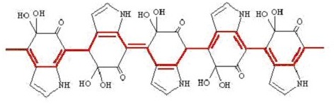 יחידת מבנה של מלנין כאשרה האלקטרונים הנעים לאורך הקו האדום, תורמים לצבע השחור של הצבען, וכן לכושר ספיגת ממלנין של אורכי גל רבים.