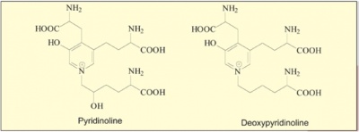 Pyd מהווה אם כן מיצלב תלת-ערכי, והוא מהווה את חלק הארי בקשרים הבין-שרשרתיים בקולאגן ממקור סחוס, וכן בקולאגן העצם. מאוחר יותר התגלתה בשנת 1987 על ידי Robbins ו-Duncan, נגזרת נוספת של Pyd, ה-deoxypyridinolin, שהוא למעשה lysylpyridinoline (להלן Dpyd). המייחד את Dpyd הוא בכך שהוא מופיע בעיקר בקולאגן העצם, אך גם בדנטין, בגיד ובקולאגן דופן העורק, שהן רקמות עם שיעור קאטאבולי נמוך. בכך הפך Dpyd לכאורה לסמן המיוחל בהיותו משקף בלעדית פירוק של קולאגן העצם. ריכוזו של מיצלב Pyd בקולאגן (type 1) של עצם "בוגרת" גבוה פי 3.5 עד פי-4 מזה של Dpyd. נוסחאות Pyd ו-Dpyd מופיעות בתרשים הבא: