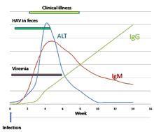 הופעת נוגדנים מסוג IgM ו-IgG, ועליה ברמת האנזים אלנין טרנסאמינאזה (ALT) ביחס לזמן ההדבקה, הופעת התסמינים הקליניים, הופעת הנגיף בצואה, והופעת הנגיף בדם.