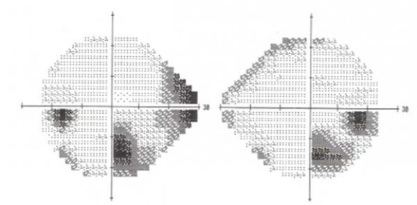 בדיקת ראייה אחרונה הדגימה חדות ראיה, תגובת אישונים ופונדוסקופיה תקינים. בבדיקת שדה ראייה נמצאה קוודרנטאנופיה שמאלית תחתונה (תמונה 1).